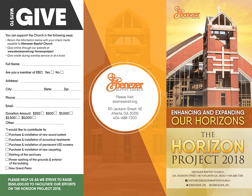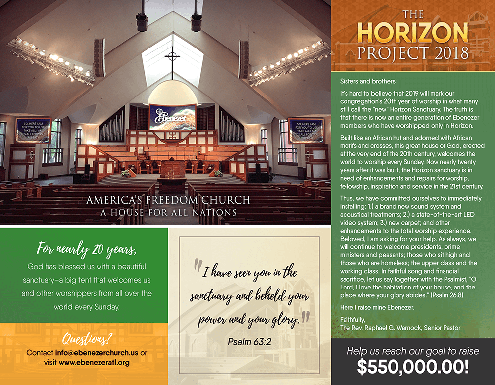 In January 2015, Ebenezer Baptist Church launched a five-year fundraising campaign to raise $4.5 million dollars to accomplish major capital improvement and debt reduction goals. These goals include: reducing the mortgage principal and improving building and ground facilities; remodeling the Education Building into a Youth Zone; developing a world-class Children’s Chapel, and College and Church School Ministries, including the modernization of classrooms and access to technology to facilitate learning; and investing in and expanding international ministries and programs.