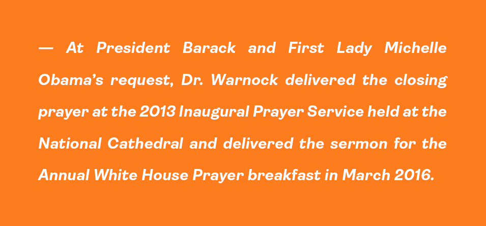 Among other honors, Dr. Warnock has been recognized as one of “Atlanta’s 55 Most Powerful” by Atlanta magazine, one of “God’s Trombones” by the Rainbow Push Coalition, a “Good Shepherd” by Associated Black Charities, “A Man of Influence” by the Atlanta Business League, one of The Root 100 in 2010, 2011, 2012, and 2013 (TheRoot.com a division of the Washington Post), one of the “20 Top African American Church Leaders” by TheRoot.com. He is a National TRIO Achiever Award recipient and has been honored by induction into Morehouse College’s Martin Luther King, Jr. Board of Preachers. Dr. Warnock is also the recipient of Morehouse College’s prestigious Bennie Trailblazer award and Union Theological Seminary’s distinguished Union Medal. The Atlanta Journal and Constitution has hailed him “a leader among Atlanta and national clergy, a fitting heir to the mantle once worn by The Reverend Dr. Martin Luther King, Jr.”