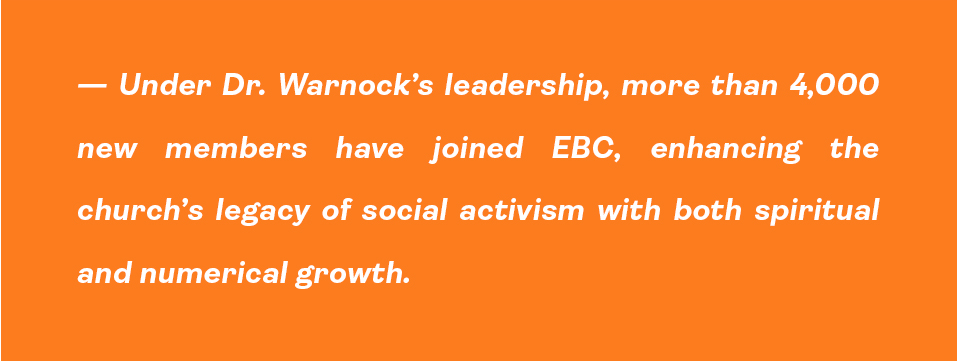 The Honorable Reverend Dr. Raphael Gamaliel Warnock serves as the Senior Pastor of the Historic Ebenezer Baptist Church, spiritual home of the Reverend Dr. Martin Luther King, Jr. and the junior United States Senator from Georgia. The son of two Pentecostal pastors, Dr. Warnock responded to the call of ministry at a very early age, and at age 35, became the fifth and the youngest person ever called to the senior pastorate of Ebenezer Baptist Church, founded in 1886. Before coming to EBC, “America’s Freedom Church,” Dr. Warnock was blessed to study and serve within the pastoral ranks of leading congregations also known for their deep spiritual roots and strong public witness. Under Dr. Warnock’s leadership, the church continues its legacy of social activism with both spiritual and numerical growth.